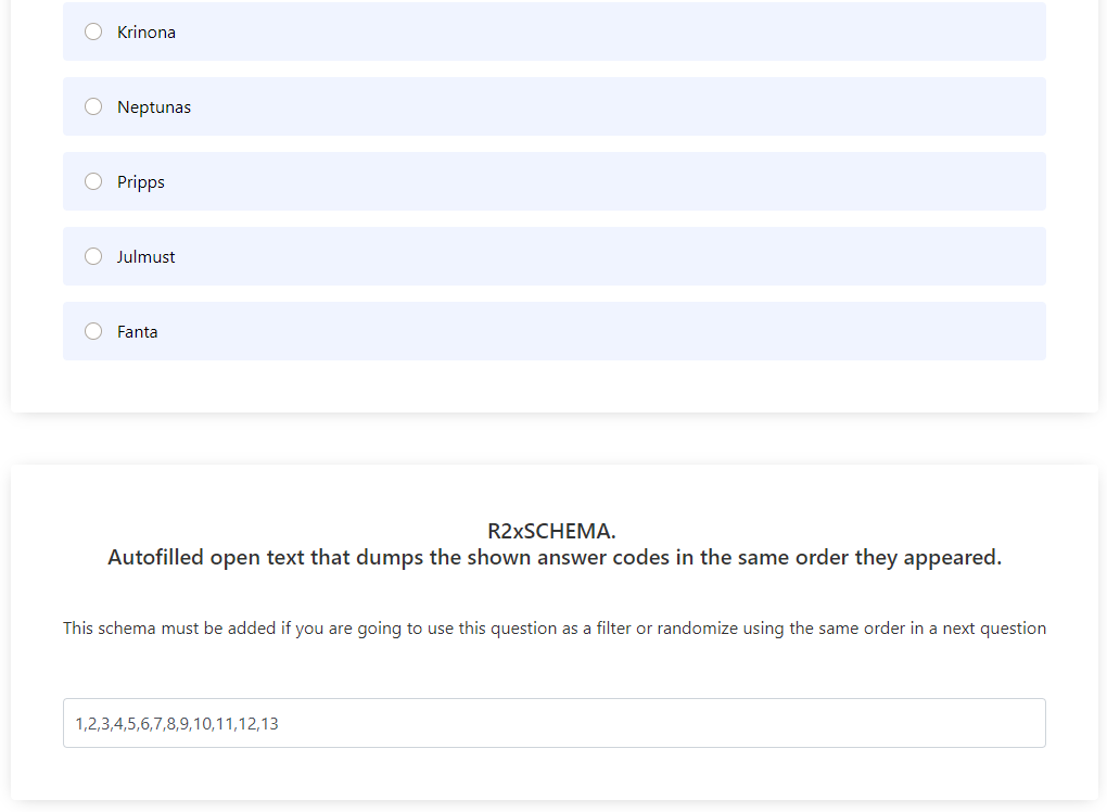 </code></pre></td></tr><tr><td><strong><code>schema</code></strong><br><br>This variable represents an open text field where answer codes will be stored. It is only required if you plan to use this question to <mark style="color:red;"><strong>filter</strong></mark> or <mark style="color:red;"><strong>randomize in the same order</strong></mark>. Remove it if not needed.<br><br><span data-gb-custom-inline data-tag="emoji" data-code="1f4a1">💡</span> Use a descriptive name for the schema that indicates it is associated with a specific question code, such as <code>Q1_SCHEMA</code> or <code>Q1xSCHEMA</code><br><br><span data-gb-custom-inline data-tag="emoji" data-code="2139">ℹ️</span> <em>The open text should be placed in the same page of the multiple choice.</em><br><br><img src="https://3256950692-files.gitbook.io/~/files/v0/b/gitbook-x-prod.appspot.com/o/spaces%2F8ViByLqKSYWJoXIHUUnY%2Fuploads%2F3e3ClosuOgnE57zgEGh1%2Fimage.png?alt=media&#x26;token=a138db89-fc20-45ee-bae0-891477657d21" alt=""></td><td><p></p><pre class="language-javascript"><code class="lang-javascript">multiple_choice({